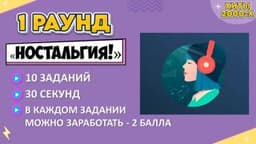 1 «НОСТАЛЬГИЯ!» - 10 заданий, 30 секунд на обсуждение, в каждом задании можно заработать – 2 балла. Задача команд назвать исполнителя песни или группу и определенный предмет, цвет и т.д из данной песни.