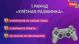 1 раунд «УЛЁТНАЯ РАЗМИНКА» - 8 вопросов на общие темы, 4 варианта ответа, 30 секунд на обсуждение.